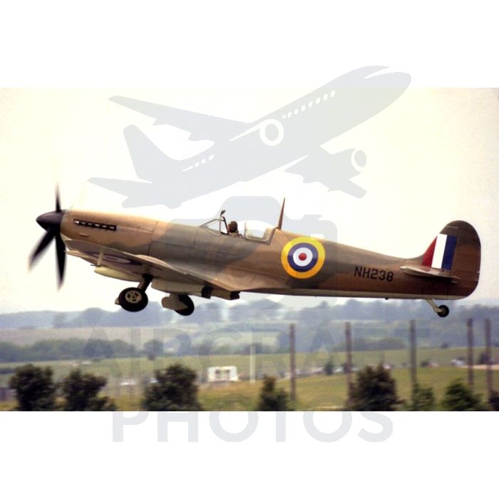 Supermarine Spitfire NH238 airborne with landing gear extended, photographed by Stuart H. Bourne. Features authentic RAF camouflage and roundel markings.